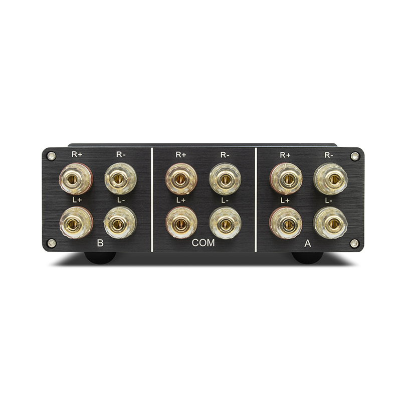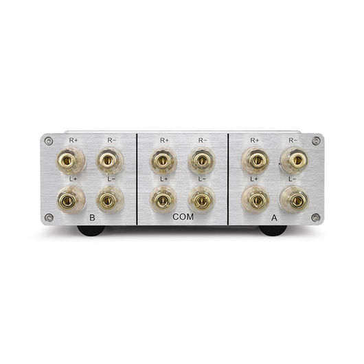 Der AMP-S III ist der Umschalter, für alle, die ein bisschen mehr wollen: das Gehäuse im zeitlosen Design ist komplett aus Aluminium gefertigt und wartet mit einer massiven, 8 mm starken Frontplatte auf. Durch den großzügig ausgelegten Leiterquerschnitt von 4 mm² sowie einem Knebelschalter mit reichlich Leistung sowie niedrigem Übergangswiderstand deckt der AMP-S III auch gehobene Ansprüche ab. Der AMP-S III bietet die Möglichkeit beim Betrieb eines HiFi-Verstärkers wahlweise zwischen zwei Lautsprecher-Paaren umzuschalten. Umgekehrt bietet dieser Umschalter natürlich auch die Möglichkeit 2 verschiedene HiFi-Verstärker (z.B. Stereo und Surround) mit einem Lautsprecher-Paar wahlweise zu betreiben. Der AMP-S III besitzt große, massive Bananenbuchsen (geeignet für Schraubklemm-Anschluss und Bananenstecker), um auch Lautsprecherkabel mit großem Querschnitt im Griff zu behalten. Der intern verbaute Leiterquerschnitt von 4 mm² sowie der massive Leistungsschalter erlauben Schaltleistungen von bis zu 600 W pro Kanal. Das edle Gehäuse aus Vollaluminium schirmt aufgrund seines Materials hervorragend ab gegen elektromagnetische Strahlung und fügt sich dank seines Designs formschön und elegant zu Ihren HiFi-Komponenten ein. Der hochwertige Schalter, der sowohl Plus als auch Minus schaltet, schützt die angeschlossenen Komponenten durch eine Nullstellung vor Kurzschlüssen beim Umschalten.